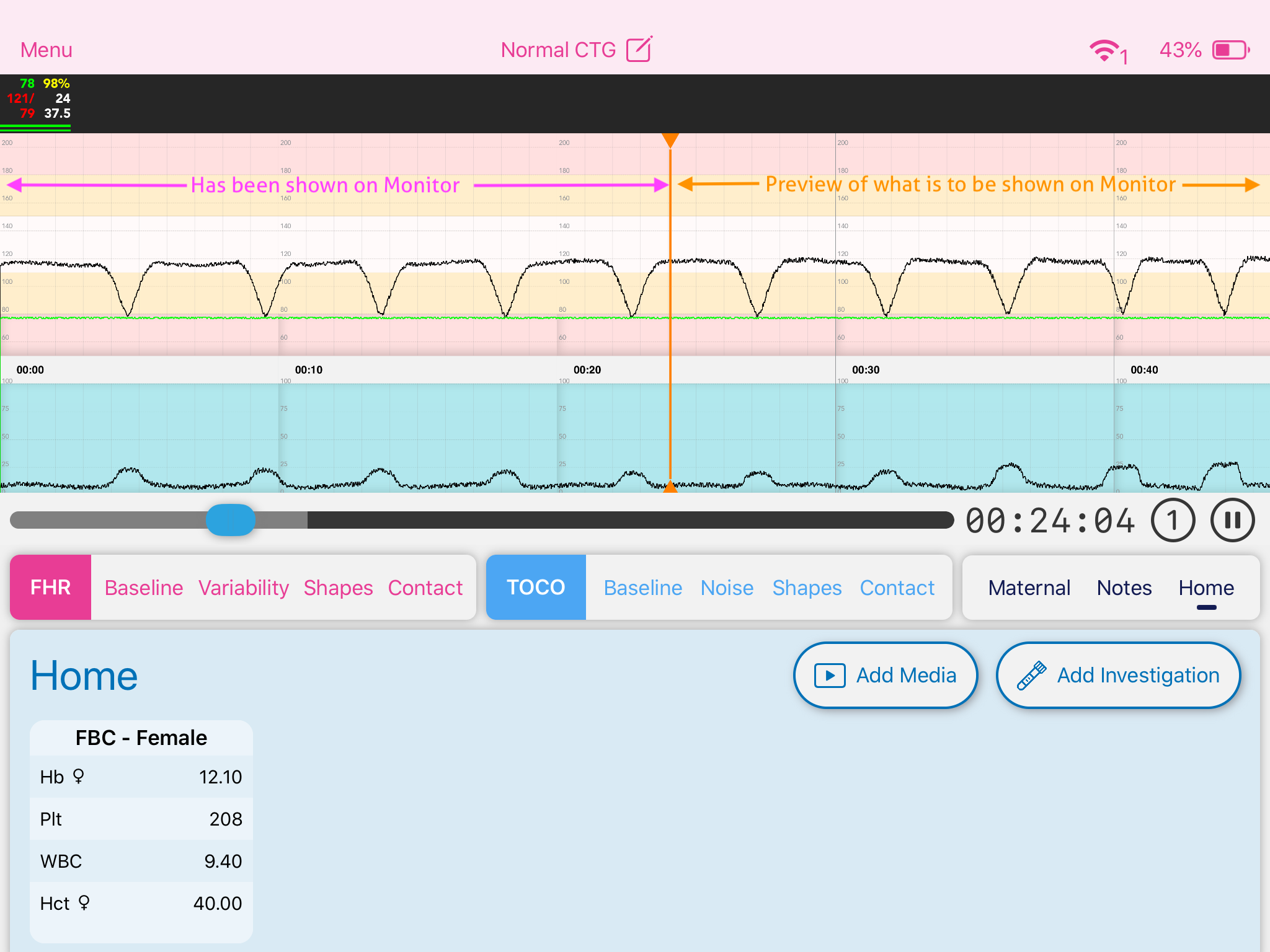 Tippen und schieben Sie den blauen Vorschau-Schieberegler, um den vertikalen Orangen Marker entlang der CTG-Spur zu bewegen.